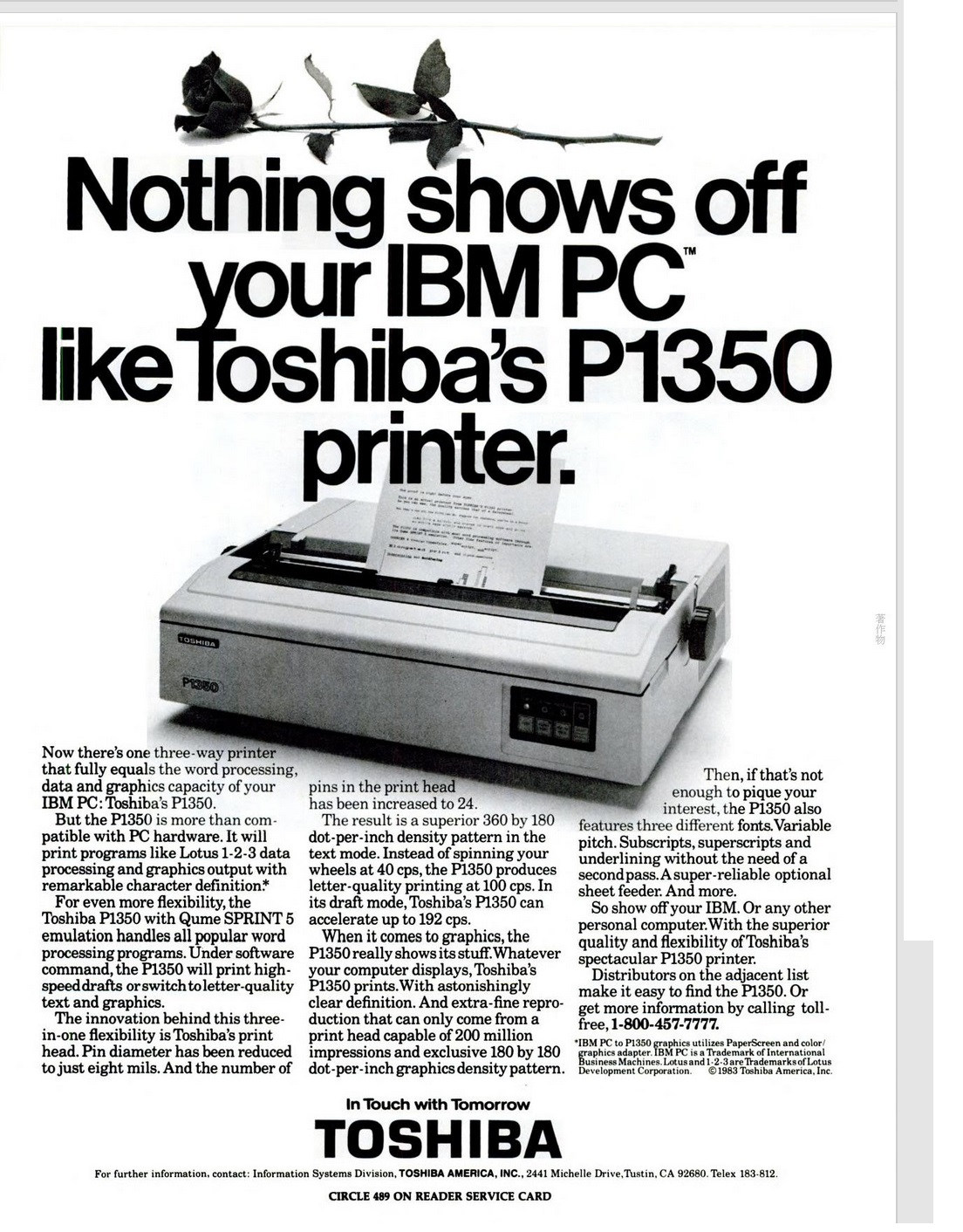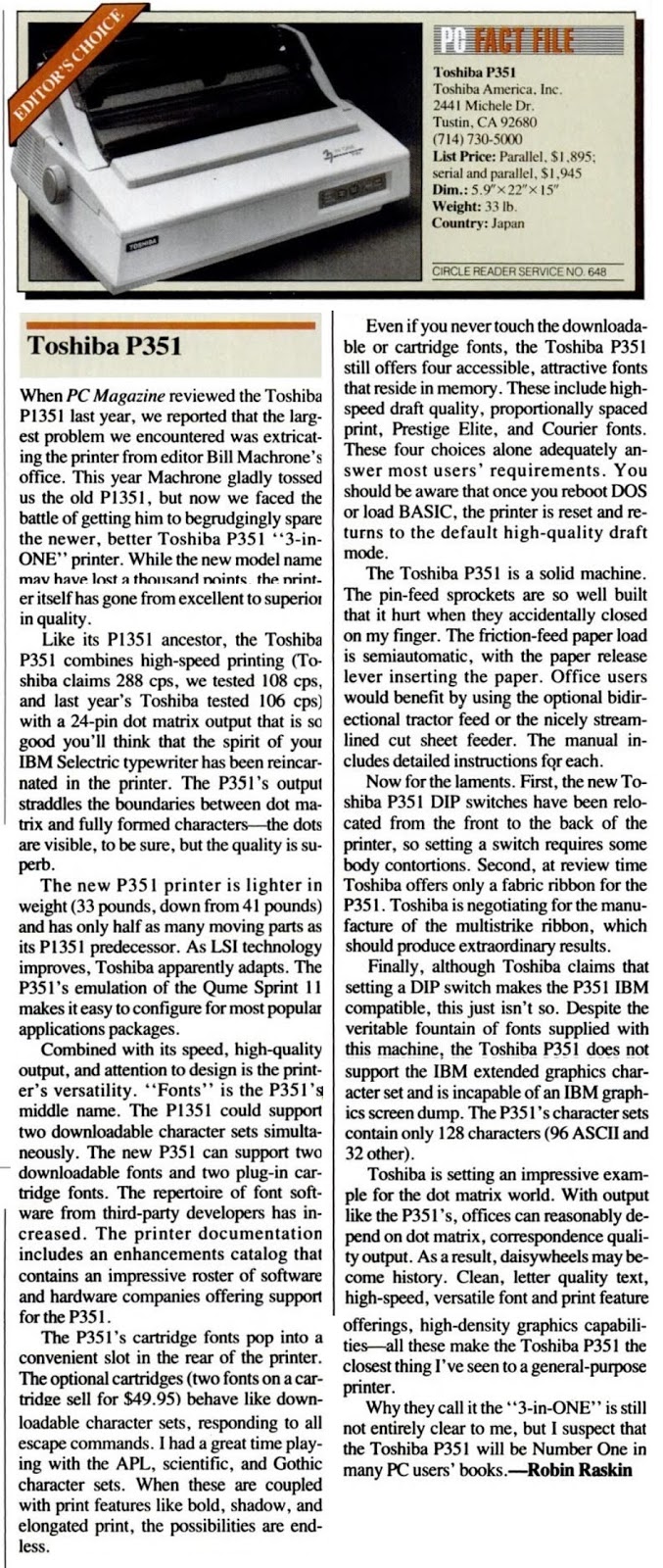 1984年11月、PC Magazineにて“どこにドットがあるのか?”と「P1351」の印字品質が絶賛される。 |