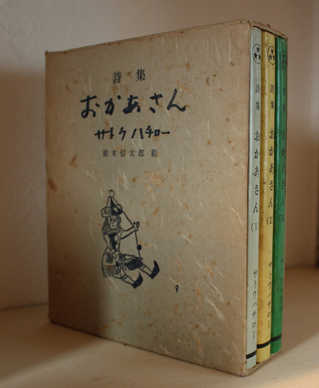 最初の詩集(1)が一番よく売れて(2),(3)と次第に発行部数が落ちるのはよくあることだと思います。これは(2),(3)がかなりの数売れ残ったので、後から函入りの本を発行して(2),(3)をまとめて売りさばき、全体の発行部数の数合わせしたのではないかと推測されます。