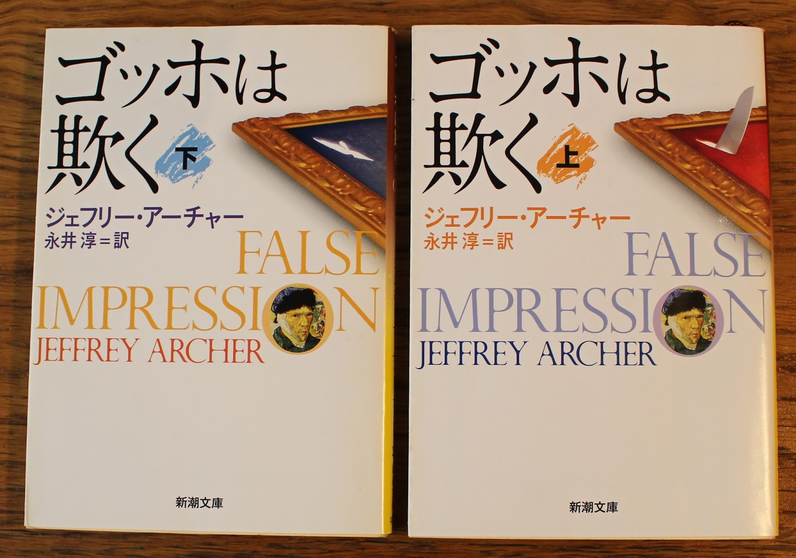 (4)「ゴッホは欺く(上)」FALSE IMPRESSION(vol.T), (c)2005 by Jeffrey Archer : 2007年2月1日発行, 2008年11月20日第3刷, ジェフリー・アーチャー 著, 永井淳 訳, 新潮文庫 ア-5-25, \629, 新潮社, ISBN978-4-10-216125-8 C0197