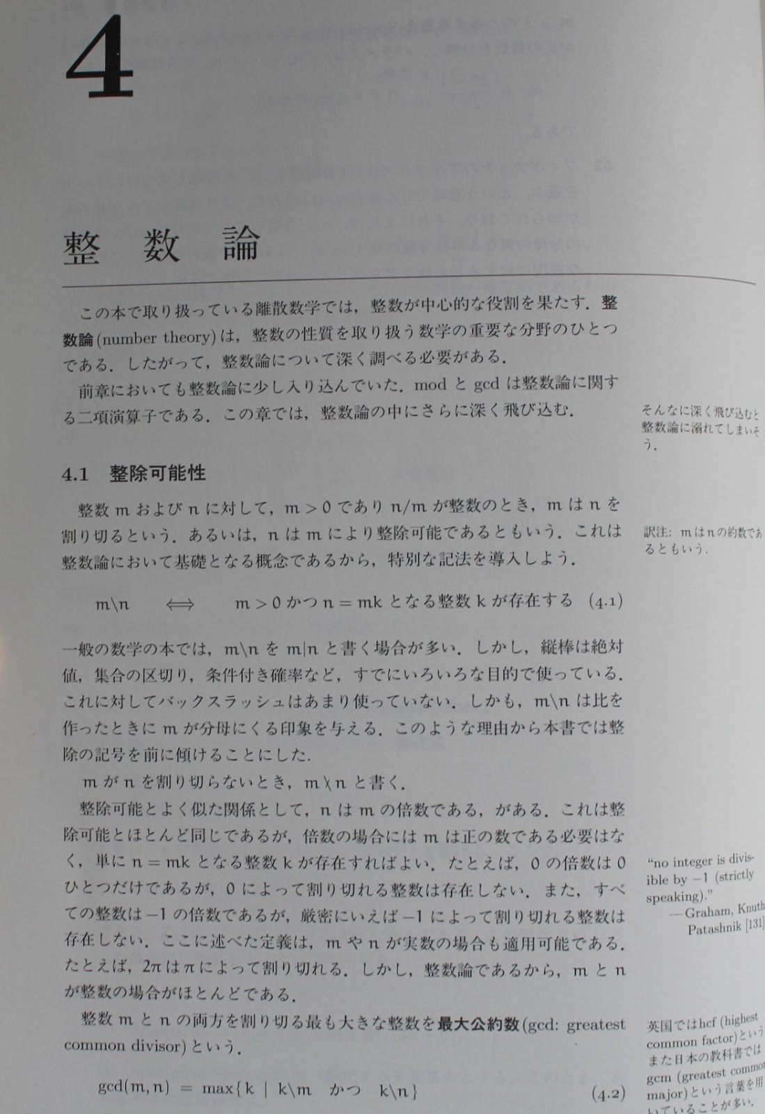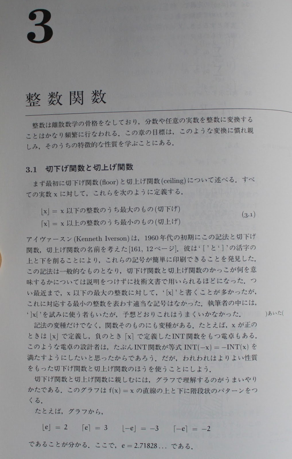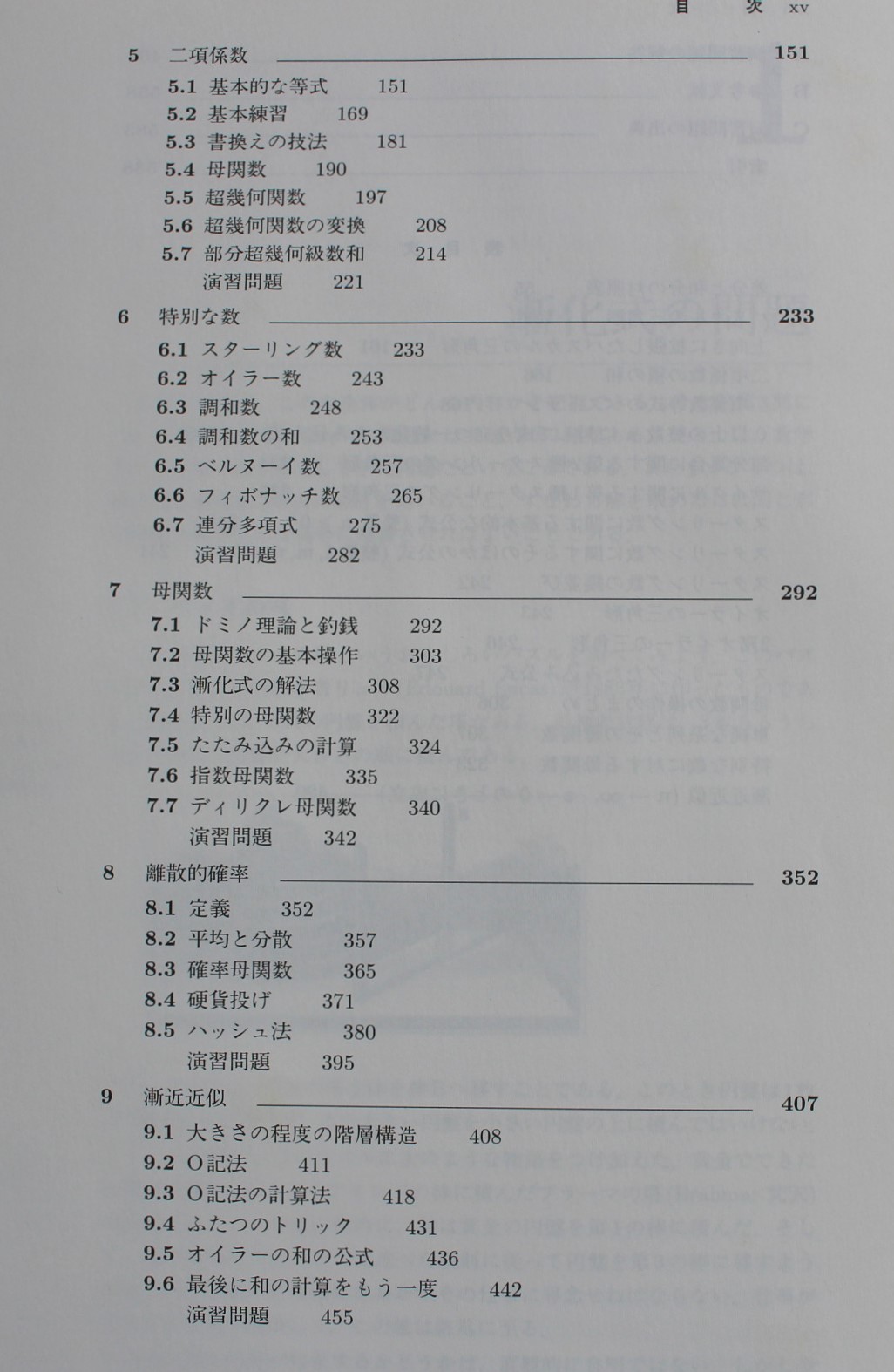 しかし最近の離散数学という科目で扱っている題材に比べてかなり異なっているので、本書の名称を離散数学( Discrete Mathematics )とするわけにはいかない。そこで、「Concrete Mathematics」という名前が最も適切であると判断することになった。 CONCRETE MATHEMATICS