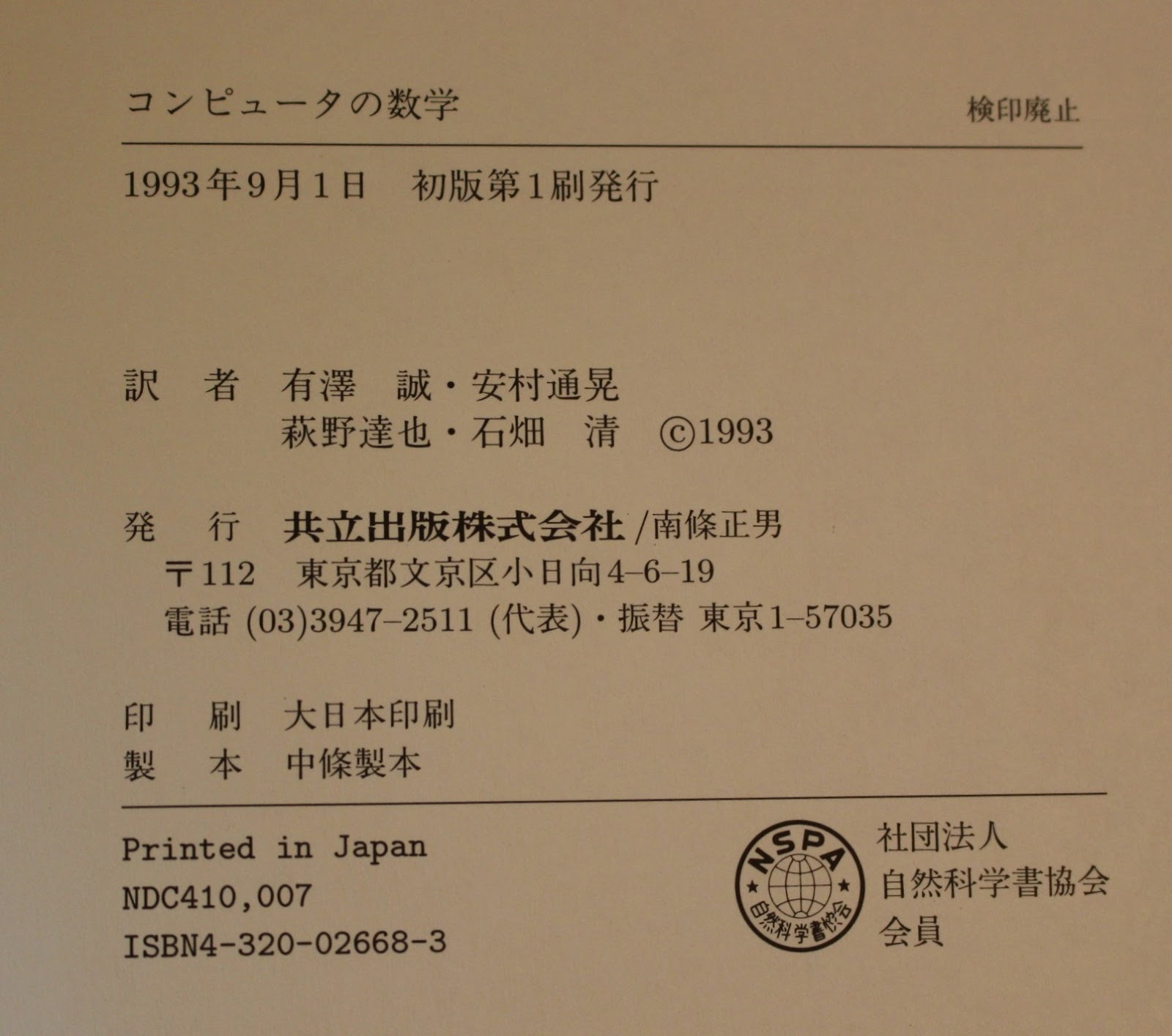 (1)「コンピュータの数学」:1993年9月1日 初版第1刷発行, 著者:ロナルド L. グレアム(Ronald L. Graham), ドナルド E. クヌース(Donald E. Knuth), オーレン パタシュニク(Oren Patashnik),