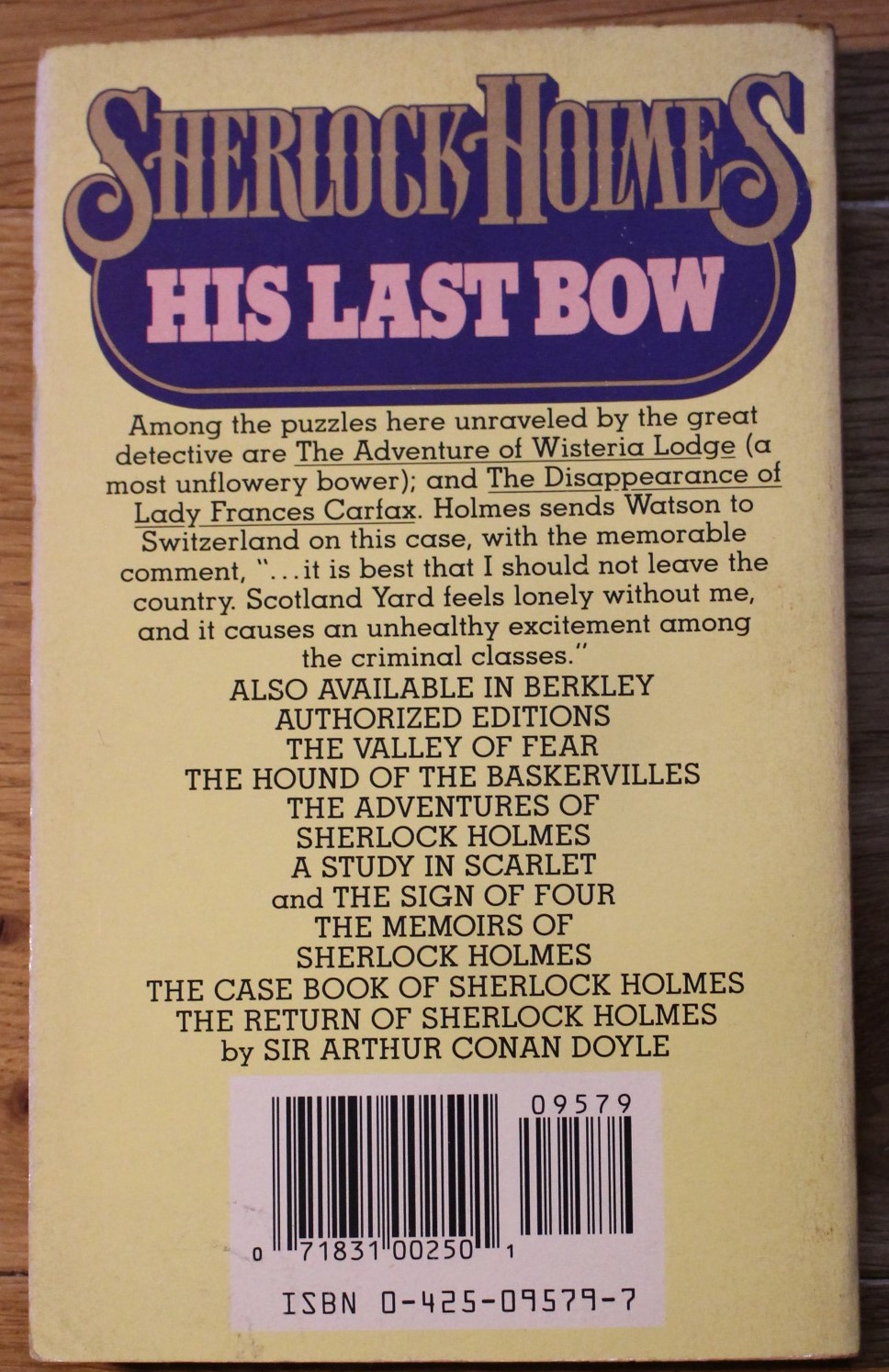 (4) SHERLOCK HOLMES「HIS LAST BOW」SIR ARTHUR CONAN DOYLE:BERKLEY BOOKS, ($3.25 CANADA), $2.50 U.S. Copyright (c)1917 by George H. Doran Co., Copyright Renewed 1944 by The Sir Arthur Conan Doyle Estates., ISBN 0-425-09579-7